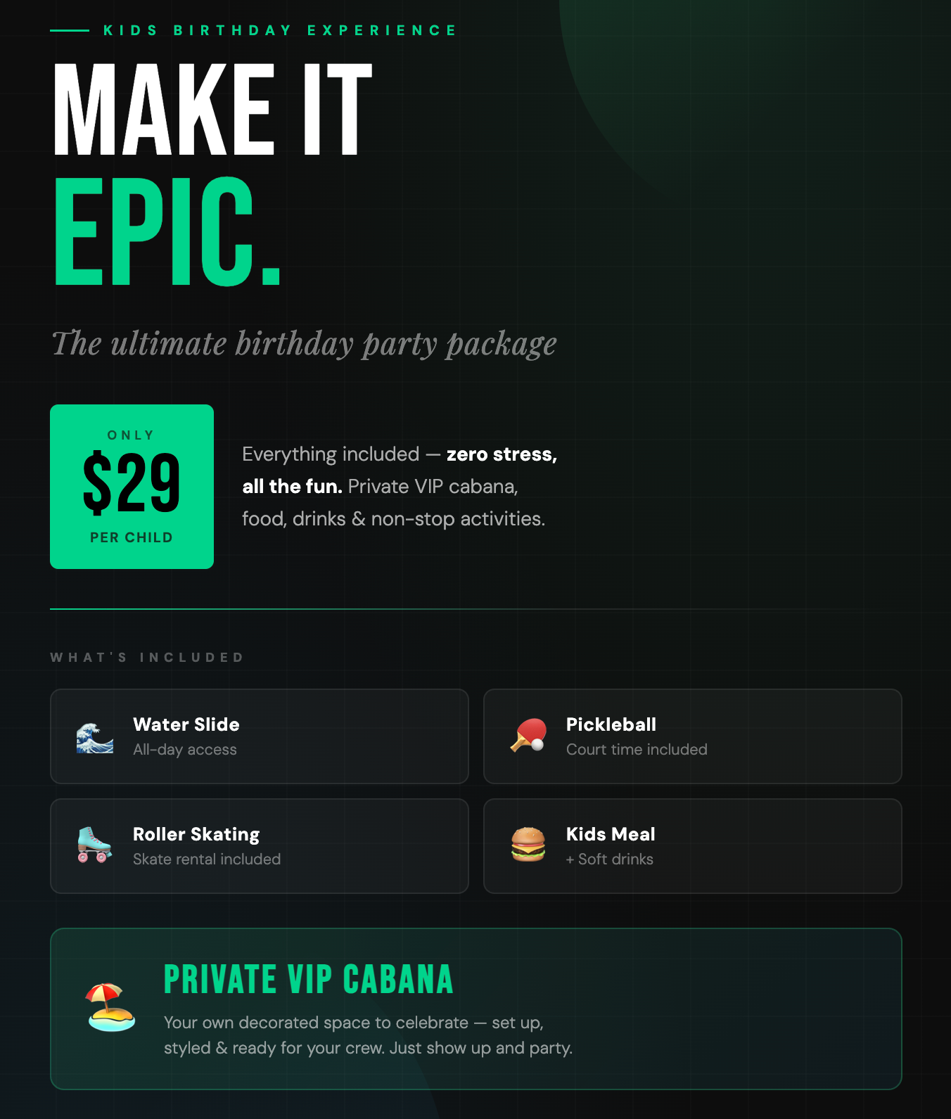 Giant water slides and slip n slides, roller skating and pickleball, beach volleyball, beach bar, tanning, and resort-style water park, all set to music, food, and nonstop island vibes.